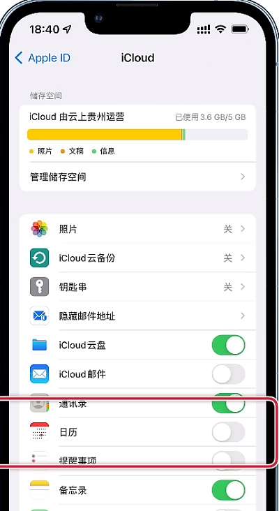 3、在此功能中,我们需要找到【日历】,然后关闭日历的网上存储功能,就可以屏蔽骚扰信息。