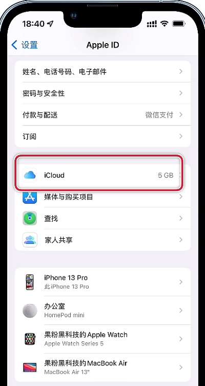 2、在自己的账号中,点击【iCloud】功能,进入到其功能中设置;