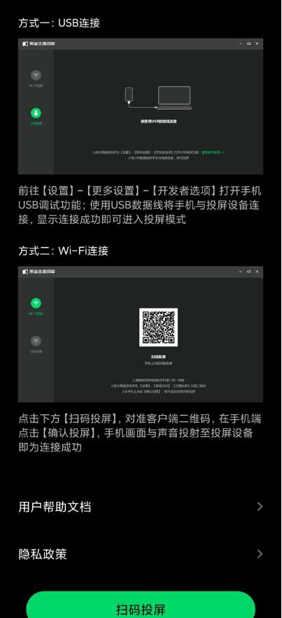 3、可以选择USB连接或Wi-Fi连接的方式进行投屏。
