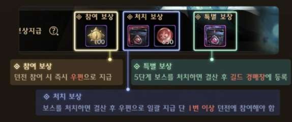 3、5个地下城将在结算后重新排列,参与副本通过邮件发送参与奖励,击杀boss时累积击杀奖励,结算后通过邮件分发,必须至少进入地下城一次才能获得击杀奖励,击败5级BOSS,结算后在公会拍卖行登记。