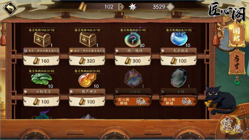 升级匠心阁可解锁闻识兑换七仞石、石髓、幻月散等稀有资源及更多的珍贵商品~