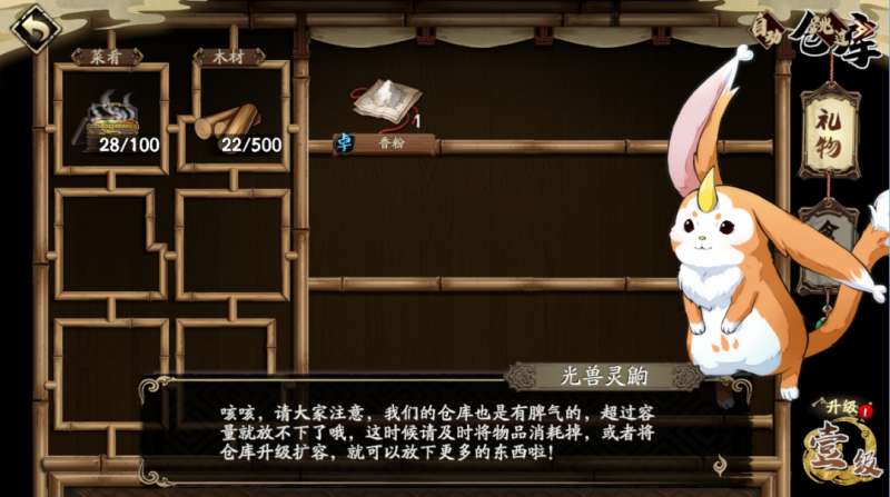 通过耕种获得的食材、通过游历带回的礼物和资源材料、通过烹饪获得的菜肴都将存放在仓库中。提升仓库等级可以增加仓库的储存上限。