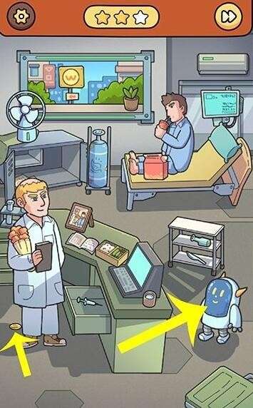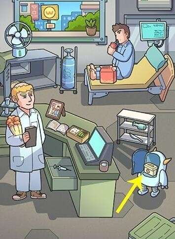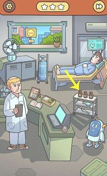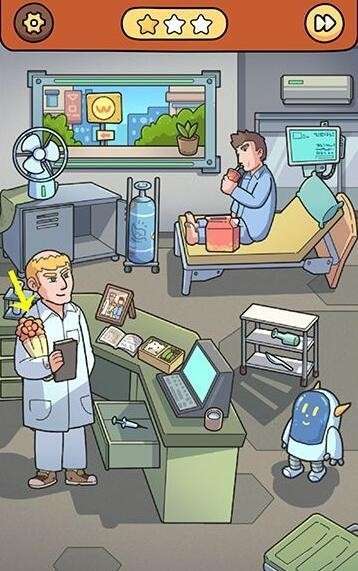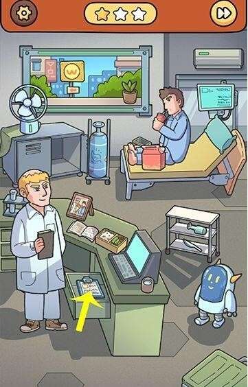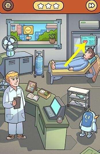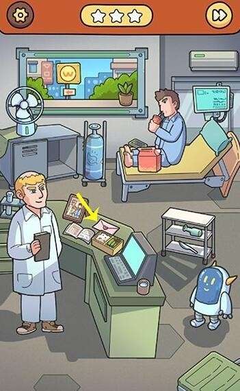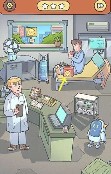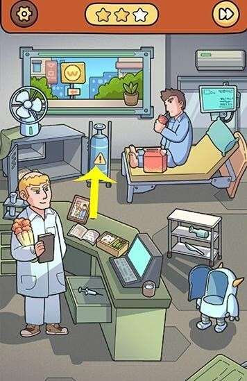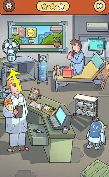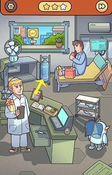 1、点击进入医院关卡后,点击电脑,输入2943,点击最大风量的图标,电扇加速吹掉医生帽子,点击收起。