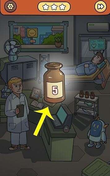 2、点击置物架上的瓶子,然后点击箭头观看一段视频,得到5号药液,点击药液给病人喝下,心变成红色点击收起。
