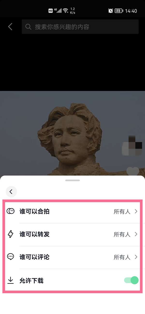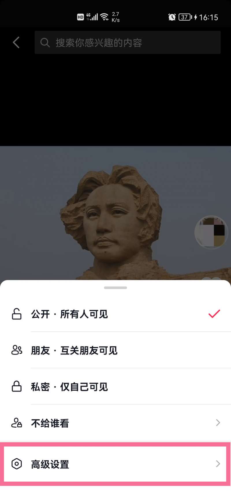 1、从抖音短视频app自己的作品中点击右下角的权限设置。