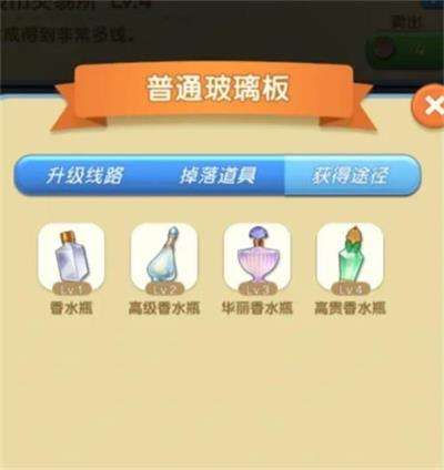 玻璃杯、钢化玻璃板通过带水的花瓣合成轿车香水,轿车香水点一下获得轿车的同时轿车香水变成香水瓶,香水瓶可以获得玻璃纱(升级路线看图4),用到了钢化玻璃板和玻璃杯。