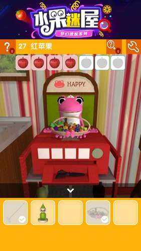 1.调查右侧的柜子,在右上方的APPLE标志中间找到第一个红苹果,在下方青蛙机上看到另外一串英文HAPPY。