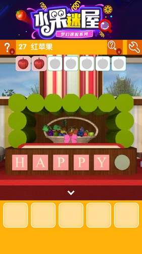 2.调查左侧的柜子,在中间的密码机上输入APPLE得到第二个苹果。然后输入HAPPY得到一筐水果。拾取盆栽后面的拖把。