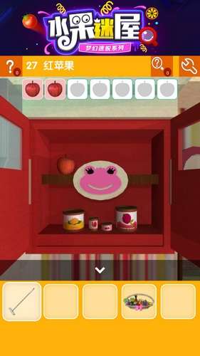 4.调查右侧的柜子,用拖把获得左上角第三个红苹果。使用密码7031打开上方的柜子,找到第三个红苹果。罐头大小顺序依次是无花果,凤梨,草莓,山莓。