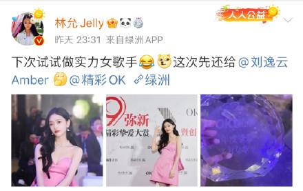 今日份爆笑,Amber和林允昨晚的颁奖拿错奖杯,两人发微博找对方有被笑到,林允下次努努力做实力女歌手。10月13日晚,知名女演员林允和知名女歌手刘逸云一同受邀参加了某著名时尚杂志举办的大赏活动,并为她俩颁发了奖杯,一个是年度挚爱最具商业价值女艺人,另一个则是年度挚爱实力女歌手,但因为主办方的失误,将奖杯给弄错了,闹了一个乌龙。