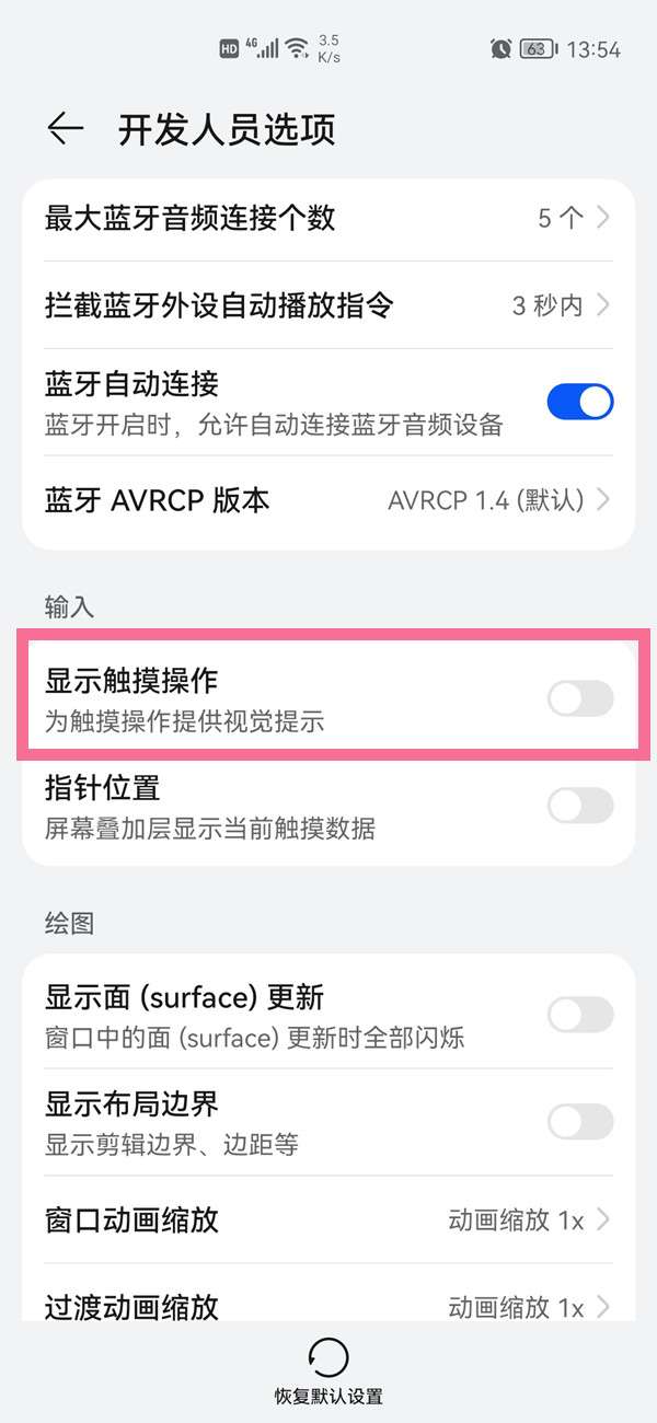 注意:只有在开启录屏后,可以在开发者模式中关闭显示触摸操作功能,关闭后将不再显示录屏触摸轨迹,但结束录屏后再次录屏时仍会显示。