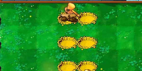 4、接着我们在深坑中使用锤子将木桩打进深坑就可以出现全新的植物,我们将植物放置在对应的位置即可阻拦僵尸的前进。