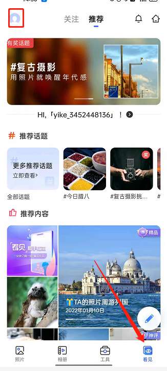 1、打开软件,点击【看见】,然后选择左上角的个人头像。