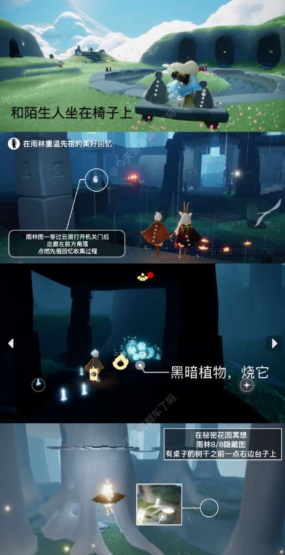 「在秘密花园冥想」在雨林8/8隐藏图内,内有桌子的树干右边石头上的石碑前光圈处打坐并留言