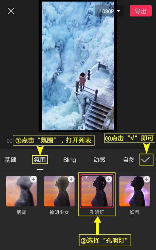 选择特效。点击“氛围”,打开列表,选择“孔明灯”,点击列表右上角的“√”即可。