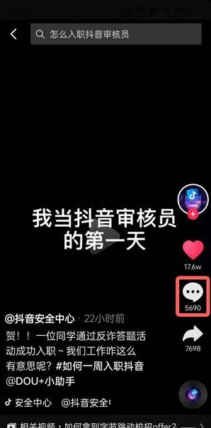 1、在抖音安全中心中找到审核员的视频,然后点击评论。
