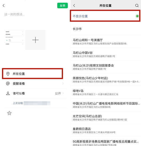关闭朋友圈定位:从朋友圈编辑的界面中点击所在位置,勾选最上方的不显示位置即可。