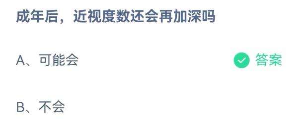 2022支付宝蚂蚁庄园6月29日的题目为:成年后近视度数还会再加深吗?正确的答案是什么呢?很多小伙伴可能还不太清楚。下面小编就为大家带来了正确答案分享,希望能帮助到你。