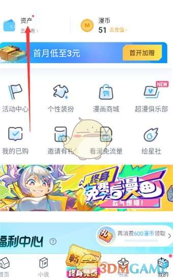 2、进入个人中心界面后,点击头像下的【资产】选项。