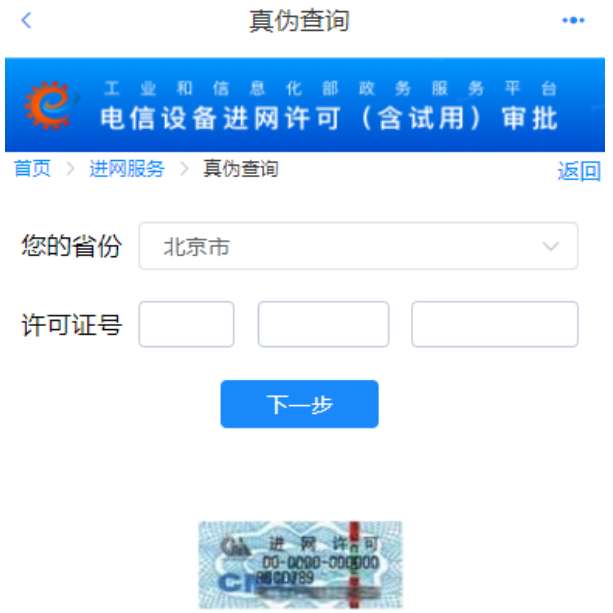 “电信设备进网管理查询”界面,选择IMEI/MEID号与进网许可(进网试用)进行验证。