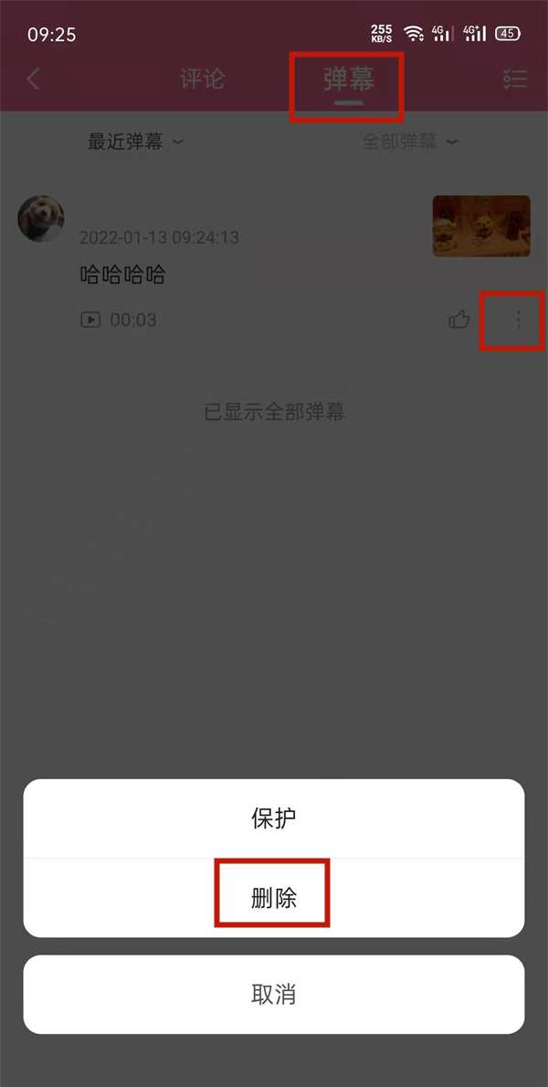 3、在弹幕列表训着发送弹幕后,点击设置中的删除即可。