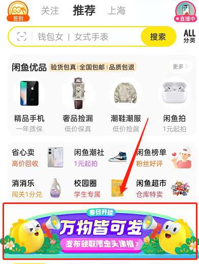 1、打开闲鱼app,在首页找到万物皆可发活动,点击进入。