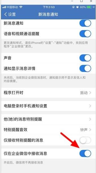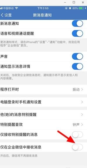 点击关闭“仅在企业微信中接收消息”,这样微信也可以同步企业微信消息了。