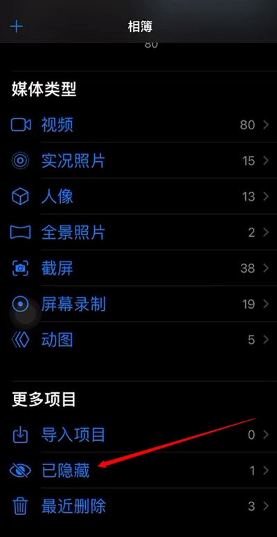 4、将手机设置中的照片的已隐藏相簿打开即可在更多中找到。
