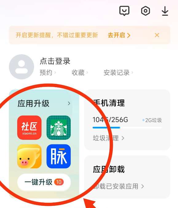 2、然后找到应用升级进入。