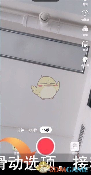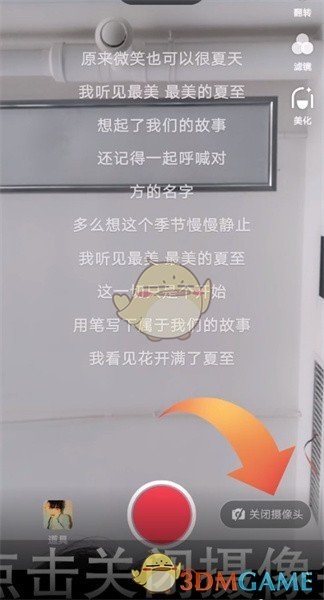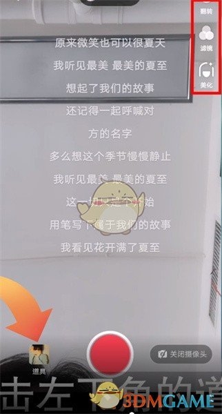 4、进入k歌页面后,用户可以翻转摄像头、选择滤镜以及选择是否美化,点击左下角的道具,便可以借助特效辅助视频录制;如果想要不显示画面,那么点击关闭摄像头即可。接着点击红色按钮,即可开始录制k歌视频。