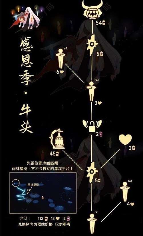 牛头先祖兑换总计:需要112根白蜡烛,2根红蜡烛,13颗爱心。