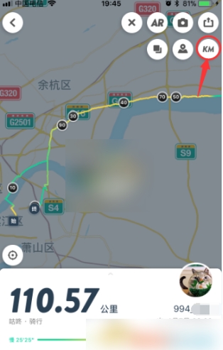 6、点击打开对应的KM图标开关即可。就会在运动轨迹上显示距离的KM距离图了