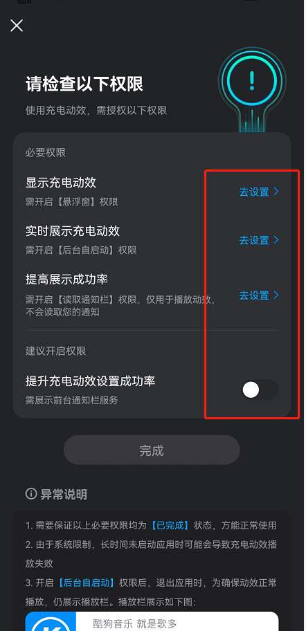 5、首次使用的用户如果没有完成一下权限是无法开启的,点击【去设置】逐步完成授权。