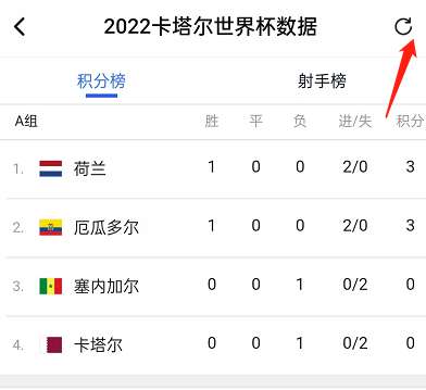 3、最后即可查看2022卡塔尔世界杯数据,包括积分榜以及射手榜,点击右上角图标可以刷新数据(如图所示)。