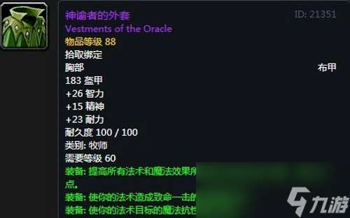 基础属性:51护甲,+13智力,+9耐力,+16精神,装备效果提高法术所造成的治疗效果,最多33点。
