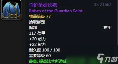 基础属性:74护甲,+17智力,+13耐力,装备效果提高法术所造成的治疗效果,最多26点,每5秒回复10点法力值。