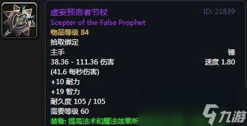 基础属性:38-111伤害,攻速1.80,+19智力,+10耐力,装备效果 提高法术和魔法效果所造成的治疗效果,最多187点,每5秒回复3点法力值。