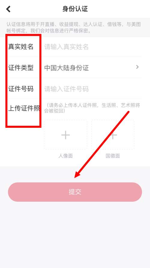 5、输入身份信息后,上传证件照,点击【提交】即可(如图所示)。