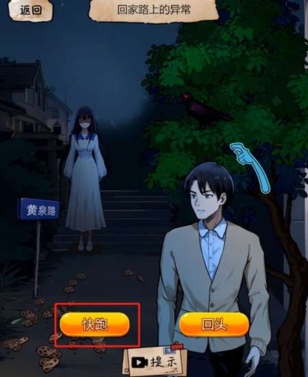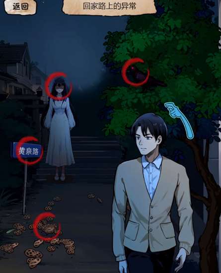2、点击后面的女人,地上的纸钱,树上的乌鸦,左滑路牌,点击黄泉路。