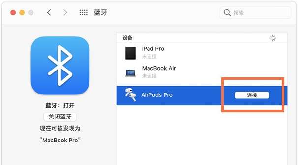 3、在“设备”列表中找到 AirPods Pro,然后点按“连接”。