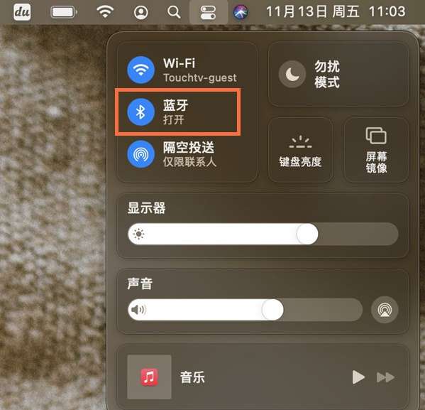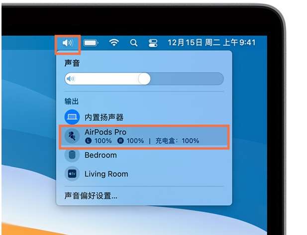 将 AirPods Pro放入耳中,然后按住 Mac 上菜单栏中的“蓝牙”菜单或音量控制菜单。然后,从列表中选取 AirPods Pro即可。