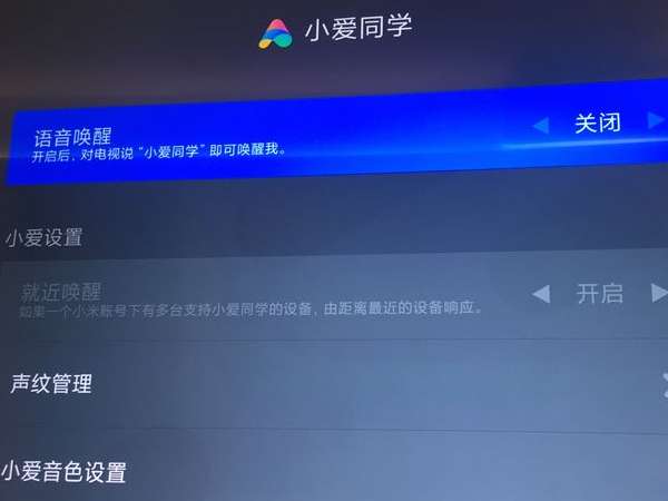 2、选择小爱同学,把语音唤醒功能开启,对着电视说小爱同学就可以唤醒了。