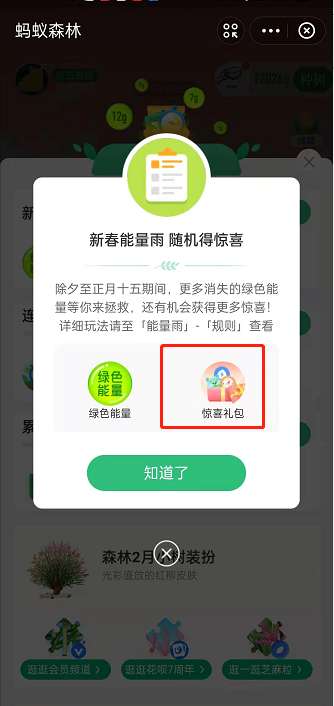 2、参与能量雨活动,我们可以在活动中获得能量和各种惊喜礼品,礼品中就有虎虎能量保护罩。