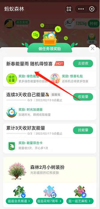 1、打开支付宝中的【蚂蚁森林】小程序,点击界面下的任务,选择新春能量雨。