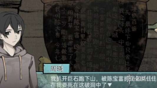 18、完成小游戏即可打开洞口,向右走,点击严禁烟火的牌子,得到一盒火柴。 19、到山洞右边使用火柴点燃地上的草席,得到草木灰。 20、点击大缸使用草木灰,观察缸上的字,选择下山。