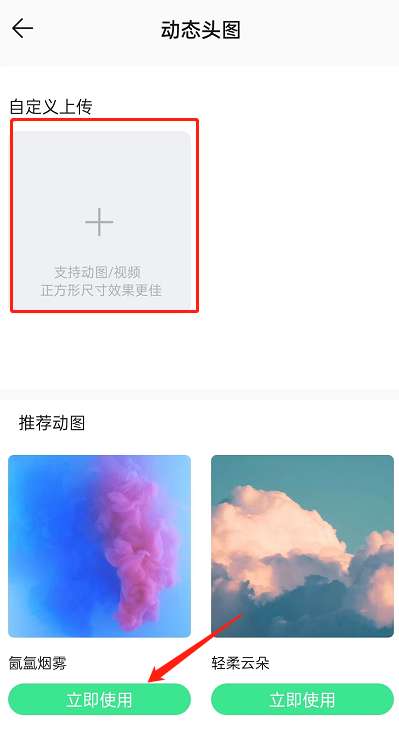 4、选择自己喜欢的动图,点击立即使用即可。也可以自定义上传动图/视频作为动态头图。