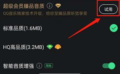 4、找到超级会员臻品音质,点击右侧试用即可,超级会员可以直接使用该音质。