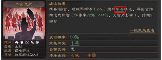四面楚歌可以给敌军群体(两人)施加中毒持续二回合(概率增加一回合负面),