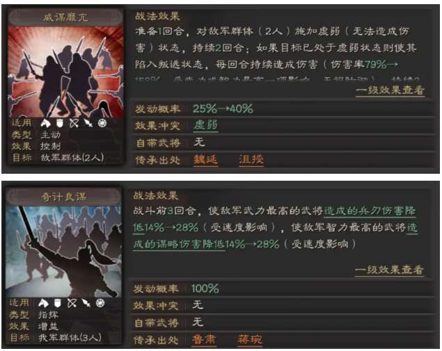 威谋与沮授联动,如果运气好可以打出高额无视防御的输出,脸不好也没有关系,因为虚弱的收益也相当大,比较克制非爆发类的单核阵容,这队打吴枪优势不小,只要没有草船,基本上优平或赢,同时奇计良谋+一回合减敌军双攻(敌军造成的兵刃最高与谋略伤害最高),所以带暂避的沮授兵书要学一个神机抢先攻在张任前行动,如果带八门的话就沮授主将,也防箕型,而张任尽量全速!