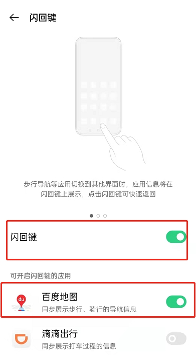 3、在闪回键页面,开启这项功能,选择一个您需要闪回的app。本次以百度地图为例。
